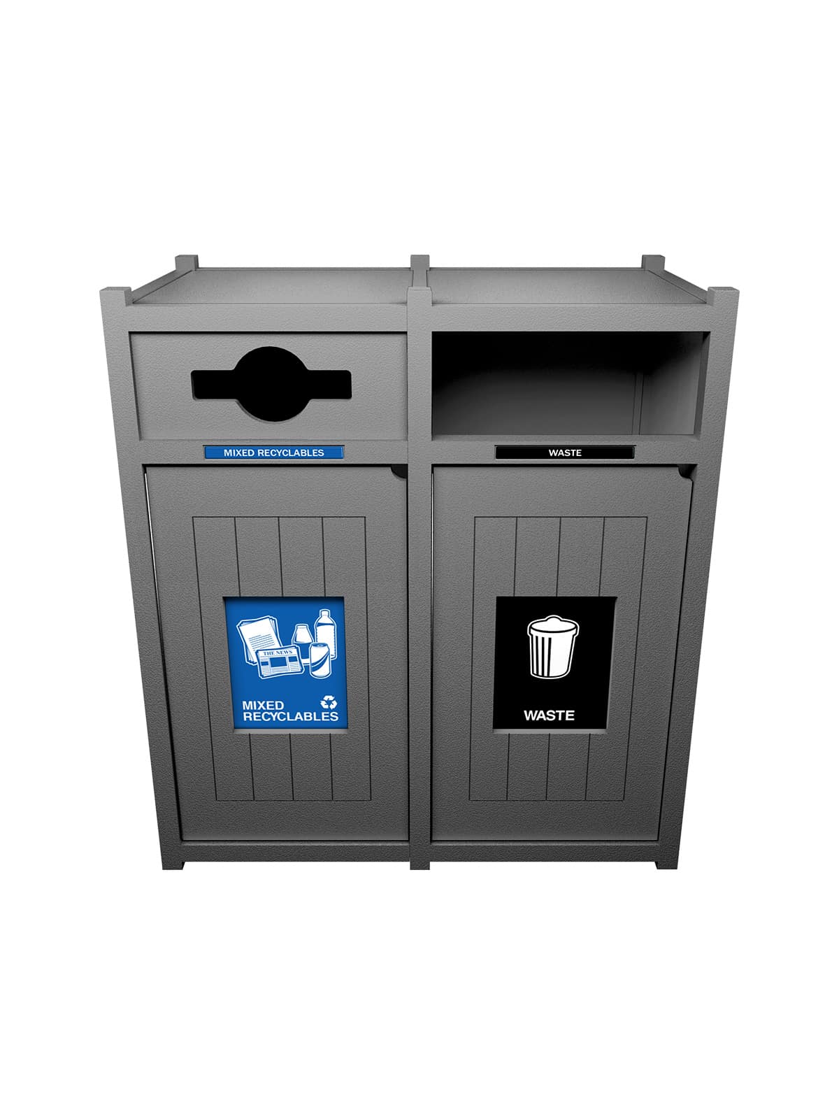 EFFECTIVE COMMUNICATION – Optional front door and backboard signage provides additional space to designate streams and divert waste, while upscale 3D labeling highlights stream differentiation